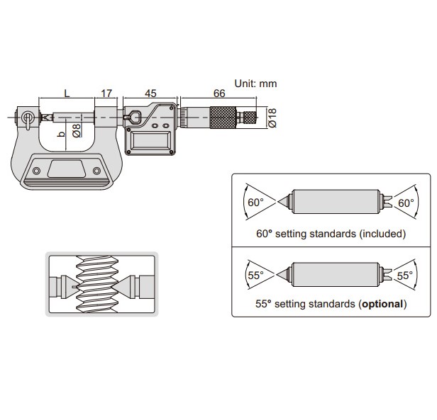 6 pairs measuring tips: Metric and unified threads (60° thread angle) 0.4-0.5mm/64-48TPI 0.6-0.9mm/44-28TPI 1-1.75mm/24-14TPI 2-3mm/13-9TPI 3.5-5mm/8-5TPI 5.5-7mm/4.5-3.5TPI |
