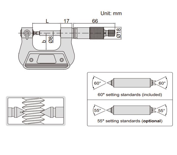 6 pairs of measuring tips: metric and unified thread (60° thread angle) 0.4-0.5mm/64-48TPI 0.6-0.9mm/44-28TPI 1-1.75mm/24-14TPI 2-3mm/13-9TPI 3.5-5mm/8-5TPI 5.5-7mm/4.53.5TPI |