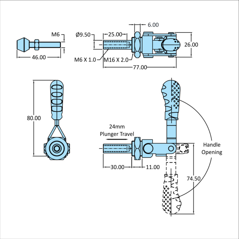 Toggle Clamps - Compact in size and sturdy construction.Suitable for high volume to light duty low volume applications.Adjustable handle allows flexible handle positioning.Appropriate for space saving installation.