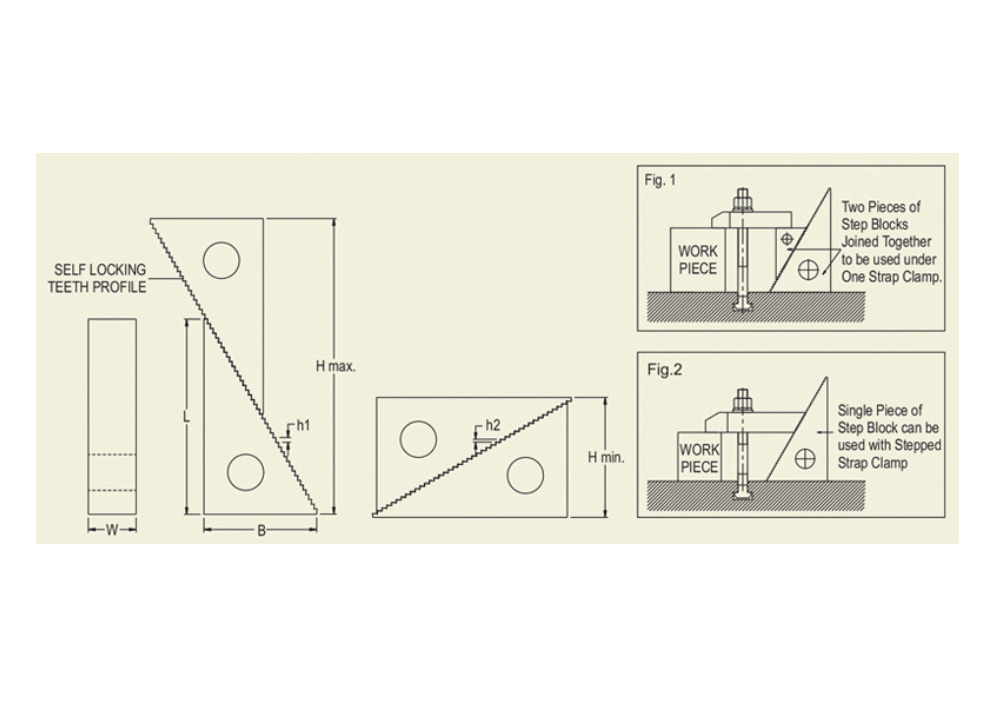 Step blocks are used as adjustable supporting blocks at the rear of the clamp while clamping the workpiece different heights can be achieved by used combination of two different sizes of step blocks. available in pair ( pair consists of 2identical step blocks)
