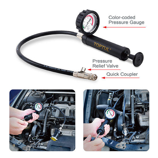 • Kit includes a pressure testing pump with gage, a thermometer needle, 1.3 radiator kits 2 connectors and a adapter handle.